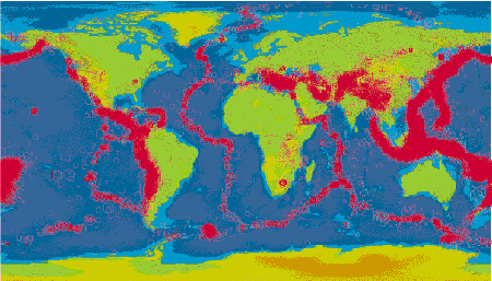 Lurrikarak eta sumendien aktibitatea nabaria den guneak mapa batean markatuko bagenu, honelako irudi bat izango genuke.